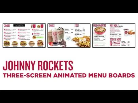 Created while at ProMotion Technology Group. Johnny Rockets franchisee provided item list and number of screens; I designed menu according to brand standards, animated pre-existing food photography assets, rendered video files and pushed content to in-store screens via a web-based content management system. Click through to view photographs and video mockups.